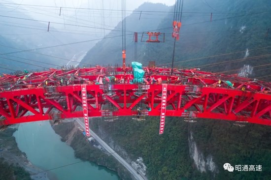 12月14日下午15时,随着最后一节拱肋吊装完成,目前国内在建最大跨径和施工难度最大的拱桥——宜(四川宜宾)昭(云南昭通)高速公路白水江特大桥主拱圈在333米的高空成功合龙。凌空起飞虹,峡谷添奇观。主拱圈的顺利合龙,标志着白水江特大桥核心部分已经施工完成,宜昭高速公路二期建设项目全线工程建设取得重大突破性进展。